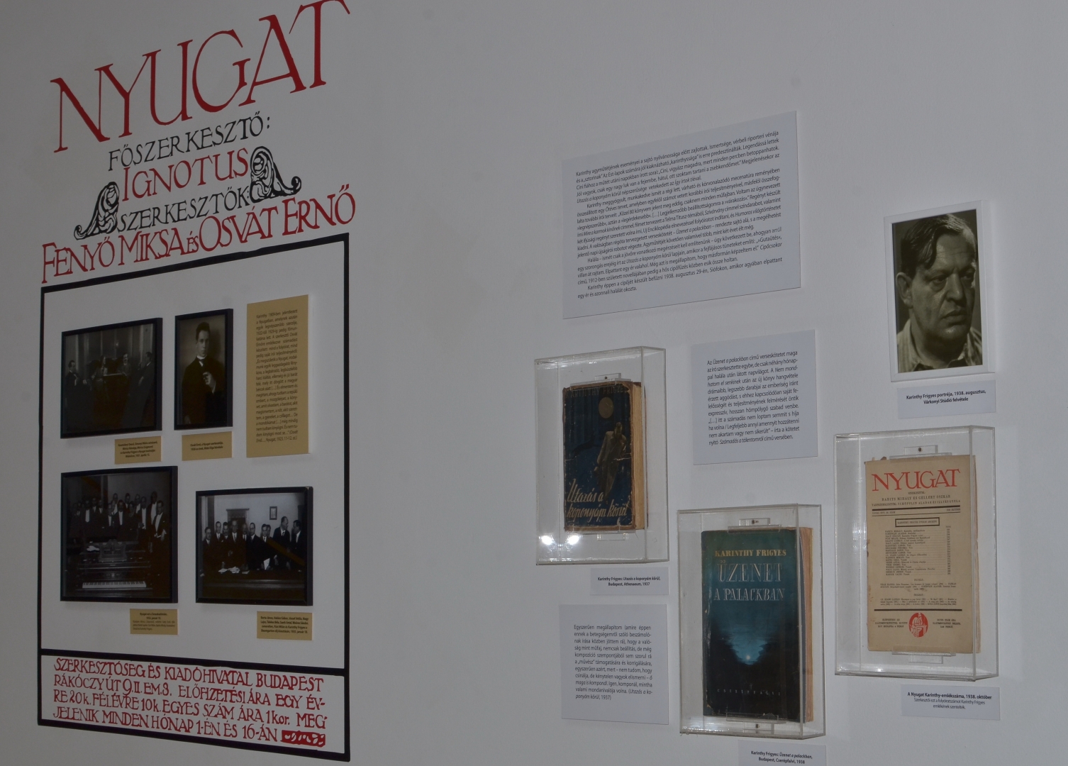 A Nyugat és a nyugatos barátságok – kiemelt figyelemmel Kosztolányi Dezsőre – is egy nagyobb kitérő a tárlat tematikájában. A következő egységre egy képeslap vezet át, amelyet „Drága Desiré”-nek (Kosztolányi Dezsőnek) címzett a Zeppelin fedélzetéről. Szenvedélyesen érdekelte minden technikai és művészeti újdonság, a fotografálás, a film, ezért a kiállítás egyik látványos helyszíne a kávéház mellett a vetítőterem. Az archív híradó- és amatőrfilm-részleteken Karinthy alakja jelenik meg fiával hógolyózva, a léghajót üdvözölve és Kosztolányival dohányozva. Ének- és beszédhangját telefonon és fülhallgatón keresztül élvezhetjük.