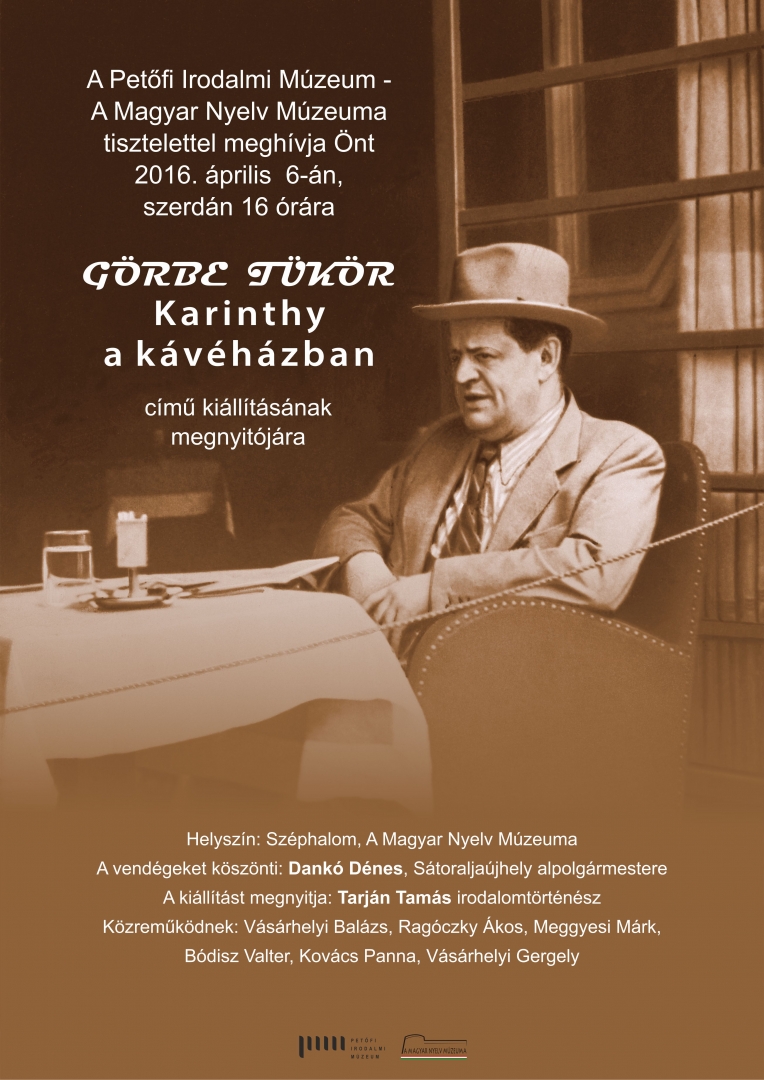 "Halló, itt Karinthy Frigyes, költő a huszadik századból!” Maga Karinthy Frigyes köszönti telefonon a Görbe tükör című kiállításba érkező látogatókat. A telefoncsörgés a kiállítás központi egységében, a korhűen kialakított kávéház egyik szegletében szólal meg, amelynek neve szintén Karinthy mondása: „Ahol az írók eszik egymást”. A valóságban Karinthy Frigyes barátaival gyakran időzött a Baross, a Valéria, a Balaton, az Otthon, a Bucsinszky, a Japán, a Dunacorso, valamint a Hadik és a Centrál falai között; a legendássá lett, egyben a Nyugat folyóirathoz tartozók törzshelyének számító New York mellett. Az író gazdag életművének jelentős része kávéházakban született. A kávéházak levegője éltető elemévé vált Karinthynak. Az itt folyó társas élet folytonos szellemi készenlétet igényelt, ugyanakkor azonnali visszacsatolást is jelentett. Írótársai figyelme közepette Karinthy itt ontotta kamaszos tréfáit, szóvicceit, gyártotta nevettető és meghökkentő történeteit, itt írta karcolatait, irodalmi karikatúráit, ötlötte ki számtalan nyelvi játékát, amelyeket éppen a kortársak írásai, a technika vagy a nők ihlettek.