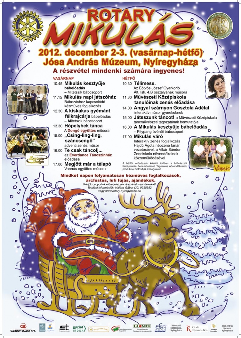 A Nyíregyházi Rotary Club a Jósa András Múzeummal karöltve december 2-án és 3-án, azaz vasárnap és hétfőn rendezi meg a Rotary Mikulás című programját. A rendezvényhez számos ismert előadót sikerült megnyerniük, többek között az Everdance tánccsoportot, Gosztola Adél művésznőt és a Dongó együttest. A fellépők mellett arcfestéssel, bábkészítéssel és gipszöntéssel egybekötött kézműves foglalkozásokra is sor kerül a múzeum több helyszínén.